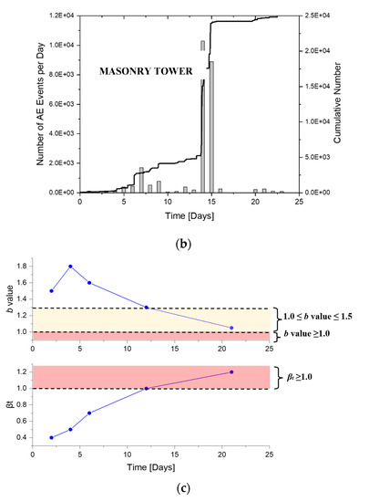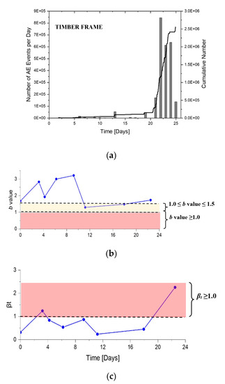 The analysis of the data extracted from the AE device followed similar steps previously observed for the monitoring of the masonry structure of the Bell Tower (see Figure 10). Figure 10a shows the AE cumulative number recorded during the monitoring period and the number of EA events for each day for the timber frame. The b-value trend was obtained working on time windows containing at least 100 AE. As observed in the case of the masonry structure, the b-value assumed numbers greater than 1.5, in correspondence with the first monitoring phase (first 10 monitoring days). After 11 days, the analysis results entered the critical band 1.5 < b-value > 1.0 (Figure 10b). In addition, as seen in Figure 10c, the βt exponent showed an evident growth after 17 monitoring days. This increment is not perfectly correlated with the b-value decrease, but the two phases can be considered just in correspondence.
