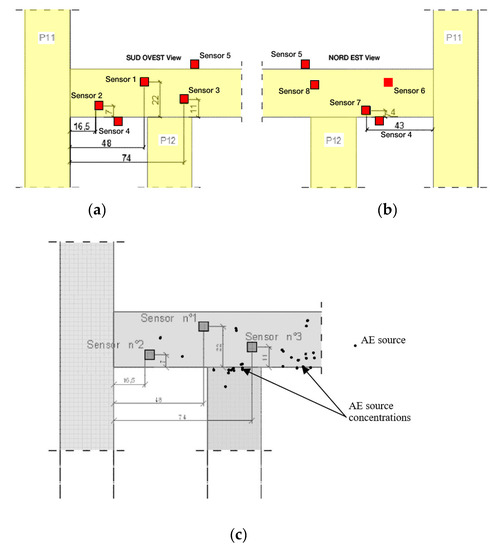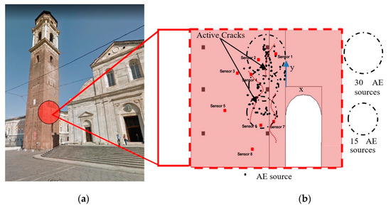 the distance between Si and source S, in Cartesian coordinates, and assuming the material to be homogenous, the path of the signal is given by |S − Si| = v(ti − t0). If the same event is observed from another sensor Sj at time tj: |S − Sj| − |S − Si| = v(ti − t0). Assuming the arrival times of the signals and the positions of the two sensors to be known, the last is an equation with four unknowns—x, y, z, and v. Hence, the problem of the localization of S is determined if it is possible to write a sufficient number of equations of that type, i.e., when the same AE event is identified by at least five sensors. If this did not occur, it would be necessary to adopt simplifying assumptions to reduce the degrees of freedom of the problem, such as, for instance, imposing the speed of transmission of the signals or having the AE source lie on predetermined plane. For the analysis carried out in the present research, three-dimensional localizations with at least five sensors were performed. In particular, Figure 8a and Table 6 indicate the position where the sensors were applied, (Figure 8b) the result of the localization with the source points projected on the surface of the facade, (Figure 8c) the relationship with the main results of the numerical model, and (Figure 8d) the detection of damage together with the crack pattern on the same portion of the structure. The localization procedure is based on the principles recently reported by the same authors concerning the signal accuracy [20]. Finally, according to the steps described in the previous section, the sources of AE events were localized. The localized points have been indicated with black points, for a total of 62 AE sources. In the figure, three circles are reported in correspondence to the center of the AE source clusters. Two levels of cluster are reported with circle radii proportional to the number of AE source inside the areas (see Figure 8b). In Figure 8d, the map of surface erosions, masonry gaps, surface damage, and cracks was reported. The AE localization allowed us to identify the portions of the masonry where active and growing cracks were concentrated (Figure 8b). These areas are also those where the highest values in compressive stresses were observed through the numerical model during the static calculus (Figure 8c).