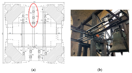 Timber structure positioned inside the bell cell at the top of the tower: (a) Plan of the cell where the timber frame layout is reported. The monitored portion is localized. (b) AE sensors disposition on the wood frame.