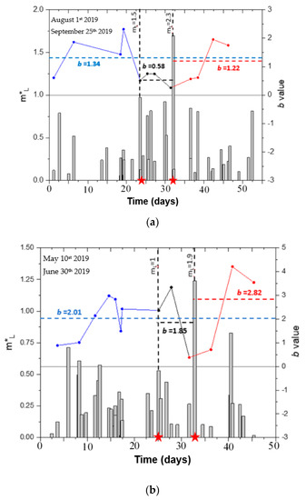These variations trends resulted particularly evident for both the two considered periods (10 May 2018–30 June 2018 and 1 August 2019–25 September 2019). For each period, two couples of events were recognized, each of them formed by one anticipant and one main event (the anticipant and the main events are distinguished by stars on the x-axis of the graph). The average values of the b-value before the anticipating events are 1.34 and 2.01 for the two periods, respectively (see Figure 13a,b). The reduced local magnitudes for the two anticipants are mL* = 1.5 (1 June 2018, Inverso Pinasca, 44°57′ N 7°13′ E, near Turin); and mL* = 1.0 (24 August 2019, Torre Pellice, 44°49′ N 7°14′ E). After these two events two phases, the first of about seven days and the second of about eight days with average b-values of 0.58 and 1.85 were observed for the two time windows. After these intervals, the expected seismic main events mL* = 2.3 and mL* = 1.9 took place (Figure 13a,b). These two events were both anticipated by the previously mentioned series where the average b-values encountered reductions of 56% and 8%. After the occurrence of the two events recognized as main events, the b-values trends returned to grow significantly—the average b-values were 1.22 for the first time window and even 2.82 for the second (Figure 13a,b). The evidence here reported is useful to understand that the discrimination criterion reported by Guglia and Weimer (2019) [21] can be applied to seismic series with reduced magnitude values (0.5 < mL < 3) and also in the case of rescaled values that follow the reduction rule reported in Equation (8).