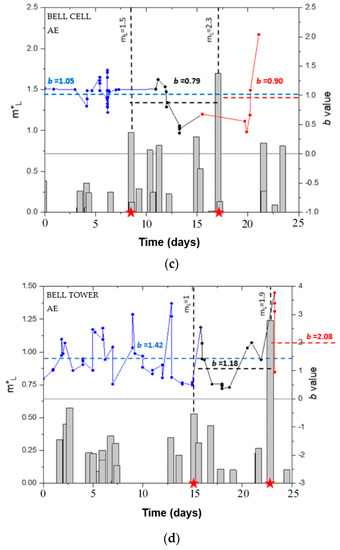 Similar considerations can be proposed in the case of AEs. Furthermore, the possibility to evaluate a close correlation between the regional seismic activity and the AE monitoring results was recently presented [18]. First of all, the AE data series were acquired for the two periods considered above, and the verification, if the couples of events previously recognized were in the AE monitoring intervals, was done. At this point, we proceeded to remove from the AE data series all signals used to determine the sources of damage through the AE localization. In this way, all the AE data directly related to the structural damage of the masonry and the wood structures were excluded from the AE time series used to evaluate the correlation between AE and seismic activity. In order to verify the original hypotheses, the historical time series of the AE data were reported for two 25-day intervals contained in the two time windows presented. In Figure 13, the seismic time series are represented together with the variations of the AE average b-values detected on the structures of the tower. In this case, the variations trends resulted particularly evident for both the two considered periods. The average values of the AE b-value before the anticipant events are 1.05 and 1.42 for the two anticipating intervals, respectively (see Figure 13c,d). After the two anticipating events, average AE b-values of 0.79 and 1.18 were observed for the two intervals before mL* = 2.3 and mL* = 1.9, respectively (Figure 13c,d). These two events were both anticipated by the previously mentioned series where the average b-values encountered reductions of 24% and 25%. After the occurrence of the two events recognized as main events, the b-values trends returned to grow significantly—the average b-values were 0.90 for the first time window and even 2.08 for the second (Figure 13c,d). The evidence here reported are very important and denounced the possibility of using the AE average b-values to offer a discrimination of the foreshock and aftershock period in a region affected by seismic activity.