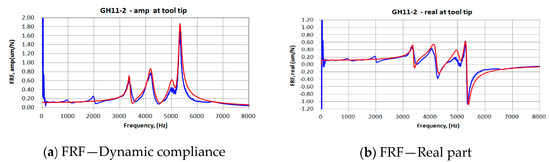 Frequency response function (FRF) of the milling cutter. (a) FRF—Dynamic compliance. (b) FRF—Real part.