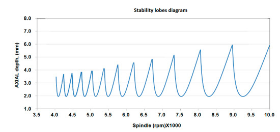 Figure 2 shows the frequency response functions of the tool end measured in the x direction. The milling cutter shows the maximum compliance of 1.82 μm/N at a frequency of 5332 Hz. Based on this dominant mode, machining stability lobes were calculated according to the analytical approach proposed by Altintas [39]. To calculate machining stability, the cutting resistance coefficients for the milling material Al6061 with a carbide cutter were identified as Kt = 796 N/mm2 and Kr = 0.21 [39]. Figure 3 illustrates the stability lobes diagram of the cutter, which suggests the machining conditions with or without chatter in terms of the axial cutting depth as a function of spindle speed. As shown in the lobes diagram, the limited cutting depth is ~2.0 mm, which indicates that stable machining without chatter can be obtained when the cutting depth below the critical value is adopted.