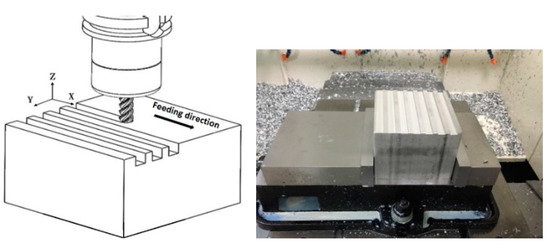 Experiments were conducted on the Feeler U600 (Fair Friend Ent. Co., Ltd, Taipei City, Taiwan) milling machine with a 4-tooth tungsten carbide end mill cutter. The workpiece material is an aluminum alloy (Al6061) with a size of 150 mm × 150 mm × 80 mm. Machining operations were performed by full immersion of slot milling, as shown in Figure 4. Each slot was milled in the X-direction under specific cutting parameters at different levels. Considering the effect of chatter on the machining process, the cutting parameters from rough to finish machining were selected within the stable regions that were defined by the machining stability lobes of the milling tool. The axial cutting depth (ap) was defined in the range of 0.1 and 2.0 mm with an increment of 0.1 mm. The spindle speed (n) was set to 3000–8000 rpm, increased in increments of 1000 rpm, respectively. The linear feed rate (f) was set at 600 to 2400 mm/min with increments of 100, which was determined by spindle speed (n) and feed per tooth of the cutter based on the formula: f (mm/min) = n (rpm) × fz (mm/tooth) × z (number of tooth). Herein, feed per tooth of the cutter was specified at two levels, 0.05 and 0.075 mm/tooth, respectively. For a given spindle speed, the linear feed rate in machining was set at lower and higher rate, respectively. During milling operations, a triaxial vibration sensor was mounted on the spindle housing to measure the acceleration signals of the vibration in the orthogonal directions (X, Y, and Z) simultaneously. For each slot machining, the average value taken from the time domain root mean square (RMS) values of the accelerations were calculated and used to compare the vibration extent of milling under different cutting parameters. After machining tests, the surface roughness (Ra) was measured using white light interferometer (Optical Surface Profiler, Zygo, NewView™ 8000 Series (Zyzo Corporation, Middlefield, CT USA). For each machined slot, roughness values were measured at five equally spaced points along the feeding direction, and then, the average of these values was recorded for subsequent analysis. There are a total of 240 machining conditions defined by the different levels of cutting parameters, including 6 spindle speeds, 2 feed rates, and 20 cutting depths.