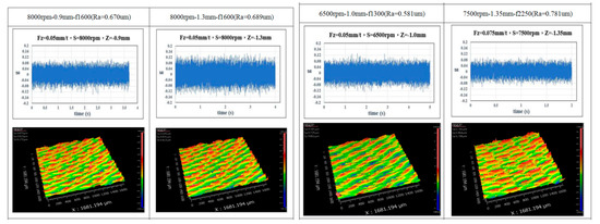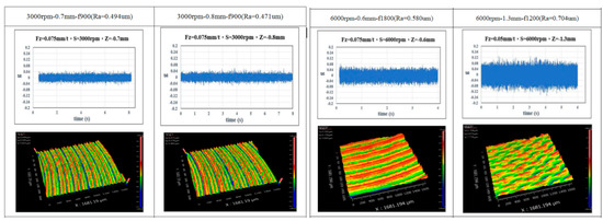 Figure 5 shows the morphologies of machined surfaces and the vibration spectrum of the milling spindle under specific machining conditions, which indicates that the cutting depth with a greater vibration level has a rougher surface. For example, for a cutting depth of 0.7 mm at a speed of 3000 rpm, Ra was measured as 0.494 μm, while it caused a vibration level of 0.035 (g). When the cutting depth was set at 0.6 mm, Ra = 0.580 μm was generated under a spindle speed of 6000 rpm with a vibration level of 0.05 (g). When the cutting depth was set at 1.3 mm, Ra = 0.704 μm was generated with the higher level of vibration of 0.83 (g).