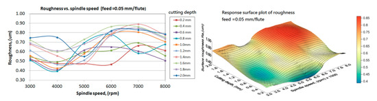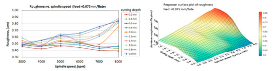 Figure 7 illustrates surface roughness with varying spindle speeds and cutting depths under specific feed of 0.05 and 0.075 mm/tooth, respectively, in which the spindle speed ranges from 3000 to 8000 rpm and cutting depth ranges from 0.1 to 2.0 mm. The response surface graphs indicate that surface roughness is affected to different extents by the combined effect of spindle speed and cutting depth, and by changing the feed rate. Overall, the roughness scatters from 0.5 µm under a lower cutting depth and spindle speed to a higher value of 0.9 µm under a high spindle speed and larger cutting depth. Further, it is noted that cutting depth has an apparent positive influence on surface roughness: increasing the cutting depth increases the roughness of the machined surface. The influence trend is more significant with a correlation coefficient (r ≅ 0.8–0.9) at feed of 0.075 mm/tooth as compared with feed of 0.05 mm/tooth (r ≅ 0.5–0.8). There is no significant relationship between the surface roughness and spindle speed defined in the range from 3000 to 8000 rpm for machining under lower feed per tooth. However, at a higher feed per tooth, the roughness increases with an increase in spindle speed when the cutting depth is greater than 1.0 mm, and the roughness decreases with an increase in spindle speed when machined with a lower depth (<1.0 mm). At a lower feed rate, the roughness increases at a spindle speed from 4000 to 7000 rpm, and then, the roughness decreases at speeds below 4000 rpm or those higher than 8000 rpm.