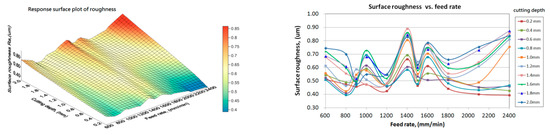 Response surface methodology is a statistical technique used to establish relationships between continuous dependent variables with independent variables in terms of mathematical models using multiple regression analysis. Prediction models derived from experimental data can help clarify the influences and contributions of cutting parameters on surface roughness or tool vibration; these models can further be applied to optimize cutting parameters [2,4,14,17,18,19,20,21]. Routara et al. [17] identified that all three cutting parameters (spindle speed, cutting depth, and feed rate) and their interactions have significant effects on surface roughness. Further, the surface response model shows significant dependence on the combination of the tool and workpiece material. Yang et al. [14] proposed an optimization process for machining conditions to ensure a desirable surface roughness based on surface response methodology. With an optimized solution, the material removal rate can be improved significantly without sacrificing surface roughness. Hayajneh et al. [22] and Joshua et al. [18], respectively, reported that feed rate has a significant effect on the surface roughness of machined alumina material compared with spindle speed and cutting depth. However, the effect of the interaction between cutting parameters has no definite tendency based on the machining conditions used in the tests. Hessainia et al. [23] conducted an investigation on the interactive effects of cutting parameters and tool vibration on surface roughness. Their results indicated that feed rate was the dominant factor affecting surface roughness, and vibrations in the radial and main cutting force directions had a low effect on surface roughness. Further, to obtain a desirable surface finish, optimum cutting parameters with less machining vibration were obtained using a predictive regression model. Ramesh et al. [24] and Premnath et al. [25] showed that the interaction of cutting speed and feed rate had a greater influence on surface roughness compared to other interactions.