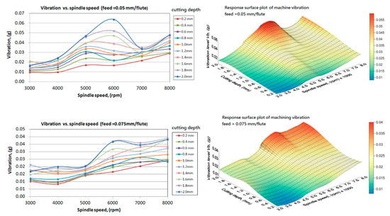 Figure 9 illustrates the variation of machining vibration with varying cutting parameters under constant feed of 0.05 and 0.075 mm/tooth. The response surface graphs clearly indicate that the vibration level induced in machining is clearly affected by the combined effect spindle speed and cutting depth. Roughly speaking, vibration amplitude increases with an increase in the spindle speed and cutting depth, as found in Figure 9. It is noted that machining with different cutting depths and at a constant feed 0.075 mm/tooth, vibration apparently increases with an increase in the spindle speed from 3000 to 8000 rpm, with a correlation coefficient (r = 0.92–0.96). For machining at a constant feed 0.05 mm/tooth, the correlation between roughness and spindle speed is not significant (r = 0.3–0.66) depending on the cutting depth. In particular, when the cutting depth is greater than 1.6 mm, the vibration level increases with an increasing speed and reaches the maximum value at a spindle speed of 6000 rpm; it then decreases with an increasing speed.