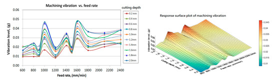 Figure 10 illustrates the variation of the vibration level generated under different feed rates and cutting depths, in which the feed rates range from 600 to 2400 mm/min, corresponding to the spindle speed from 3000 to 8000 rpm and feed of 0.05 and 0.075 mm/tooth. The extent of the effect of feed rate on the vibration varies with a cutting depth in machining. Within the entire testing data, there is no significant correlation between the vibration level and the feed rate. However, as observed in Figure 10, at a lower cutting depth (Z < 0.8 mm), machining vibration is slightly increases with increasing the feed rate, with a correlation coefficient (r = 0.6–0.7). In addition, within the testing conditions (Z > 1.0 mm, F = 1800–2000 mm/min, and S = 6000–8000 rpm), the machining vibration apparently increases with an increase in the feed rate, spindle speed, and cutting depth, which shows a significant influence on vibration (r > 0.8), and therefore a negative influence on the surface equality, as shown in Figure 10.