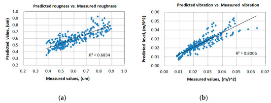 In this case, the determination coefficients (i.e., R-square and adjusted R-square) between the predicted values and measured values are around 0.67. It is found that the input variables associated with the cutting parameters have significant influence on surface roughness, with a small p-value < 0.05; however, the effect of machining vibration is insignificant. The average percentage of prediction accuracy for all testing data is ~90.05% with an RMSE of 7.57%, and this shows that the surface roughness can also be predicted with good accuracy based on the cutting parameters and the measured vibration level in machining.