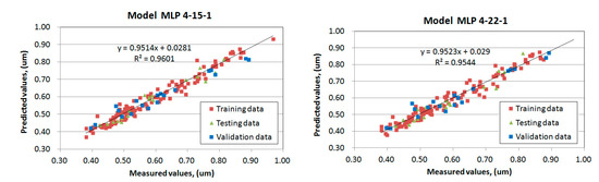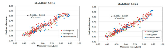 The statistical values for the ANN model, correlation coefficient (R), RMSE, and MAPE are used as the basis for determining the performance of the neural network, as summarized in Table 6. The value of R represents the agreement extent between the predicted values and measured values. The values of R for the models MLP 3-12-1 and MLP 3-13-1 within the training, validation, and testing data are in the range 0.9285–0.9693. For neural models with an additional variable (machining vibration), higher values of R are found in the range of 0.9611 to 0.9785. Figure 13 shows the comparison of measured and predicted data of the surface roughness for all data, which indicate that high agreements of the prediction results with a correlation coefficient are achieved by neural network models.