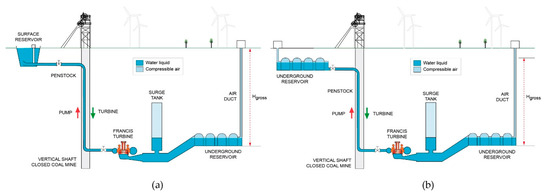 UPSH scheme in a closed mine. (a) Surface upper reservoir and underground lower reservoir; (b) Shallow upper reservoir and underground lower reservoir.