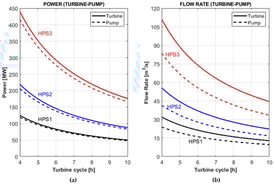 Technical data of HPS 1, HPS 2 and HPS 3, considering daily turbine cycle times at full load (DTCs) between 4–10 h day−1. (a) Power in turbine and pump modes; (b) water flow rate in turbine and pump modes.