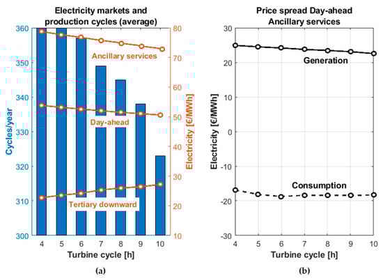 Concerning Figure 4a, the number of annual generation cycles is calculated to obtain the amount of electricity generated in turbine mode. The electricity consumed in pumping mode is estimated assuming a round trip energy efficiency of about 0.77. The annual generation cycles decrease from 360 to 323 when the DTC increases from 4 to 10 h. The maximum price of electricity is 78.74 € MWh−1 and is reached when participating in the ancillary services markets. That value, which corresponds to a DTC of 4 h, is progressively reduced by 7% when the DTC increases to 10 h. The minimum price in consumption mode is 22.13 € MWh−1. This cost for purchasing energy is increased by 22.81%, reaching 27.18 € MWh−1 when the DTC increases to 10 h. In Figure 4b, it is shown that the maximum price spread between the day-ahead and the ancillary service markets in generation mode is 24.92 € MWh−1. In consumption mode, the maximum price spread reaches −16.88 € MWh−1. The price spread decreases by 2.36 € MWh−1 in generation mode and 1.42 € MWh−1 in consumption mode when the DCT increases to 10 h.