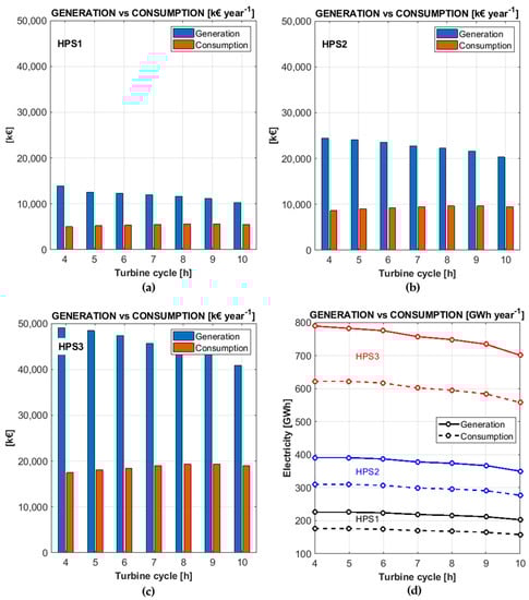 For the purpose of analyzing the economic feasibility of the three HPSs considered in this study, the amount of energy generated and consumed and the maximum income from selling energy in generation mode (turbine) and minimum costs for purchasing energy in consumption mode (pumping) are shown in Figure 5 for the three HPSs. The maximum income decreases while the minimum expenses increase as the DTC increases from 4 to 10 h (see Figure 5d).
