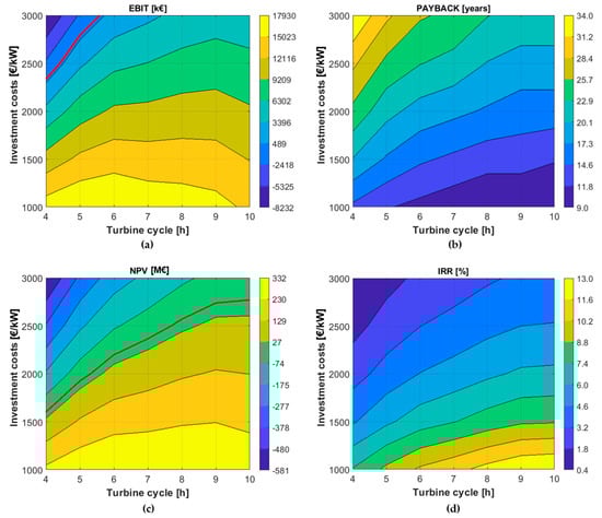 Feasibility analysis of HPS 3 with surface upper reservoir, considering DTCs between 4 and 10 h and investment costs between 1000 and 3000 € kW−1. (a) Earnings before interest and taxes (EBIT), where the red line represents zero EBIT; (b) payback period; (c) net present value (NPV), where the red line represents zero NPV; (d) internal rate of return.