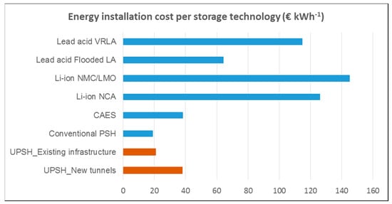 The installation cost of energy storage technologies (€ kWh−1) has been compared with UPSH plants. Figure 7 shows the planned installation cost of a number of energy storage types for 2030 and highlights the low cost of conventional PSH (19 € kWh−1), followed by CAES systems (38.26 € kWh−1) [2,34]. Electrochemical storage like lithium-ion is still more expensive to install, but it is more efficient at storing and releasing energy, opening it up to a wider range of potential applications [34]. The installation cost of UPSH plants using the existing infrastructure reaches 20.90 € kWh−1, while the cost of UPSH considering the excavation of new tunnels increases to 38 € kWh−1.