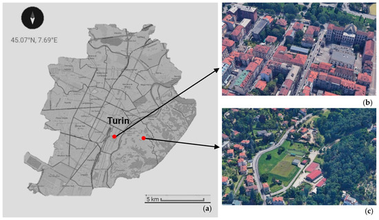 (a) Turin map and satellite (Google Earth) images of the considered sites: (b) Campana street garden (CA) and (c) Nobile Park (NOB).