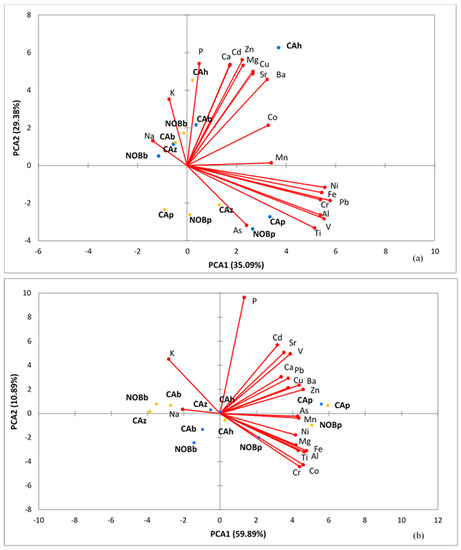 Score and loading plot from principal component analysis (PCA) (PC1 vs. PC2) on element concentration data of (a) epigeal and (b) hypogeal parts. NOB = plants grown in Nobile soil, CA = plants grown in Campana soil, yellow spot = addition of FW to the soil, blue spot = no addition of FW, p = Pteris vittata, b = Brassica juncea, h = Helianthus annuus, z = Zea mays.