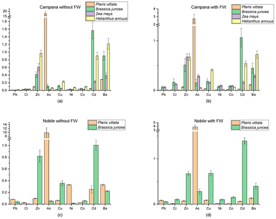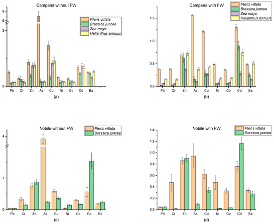 Figure 3 shows the values of bioconcentration factors of plants grown in Campana (a, b) and Nobile (c, d) soils for PTEs, and the results obtained by the PCA are confirmed. P. vittata shows an excellent bioconcentration ability—its action is particularly marked for As and Pb, but it is also efficient for other PTEs to become one of the most capable species for lead uptake.