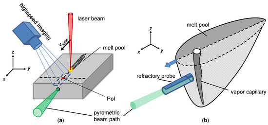 Schematic of the process observation: (a) total view of the sample showing pyrometry and high-speed imaging methods during the welding process, and (b) close-up on the melt pool probing.