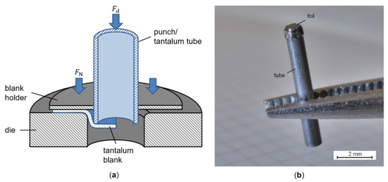 Preparation of the refractory tantalum probes: (a) deep-drawing process of the tantalum foil, and (b) a finished, ready-to-use probe.