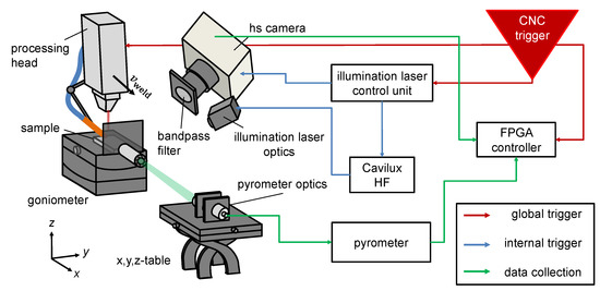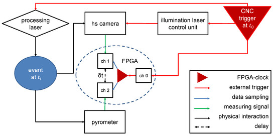 Regarding the geometrical characteristics of the melt pool generated during deep-penetration laser welding, including the vapor capillary, the different regions that are probed along the welding axis can obviously be of very short extent. The Knudsen layer, with a theoretical thickness in the order of magnitude of LK~10 µm [13], is the thinnest characteristic keyhole region to be distinguished in the literature. Welding at welding velocities in the range of 30 mm/s up to 65 mm/s therefore corresponds to very short time intervals of about tK~100 µs in which the characteristic behaviors can be probed. Due to this temporal restriction, not only are high sampling rates necessary but, also, the synchrony of the employed measuring devices must be assured within strict tolerances. The employment of different measuring devices is always affected by a time delay δt between the different signals resulting from the inner runtimes of the respective devices. Therefore, even though the signals are sampled simultaneously by the FPGA controller, they do not necessarily correspond to the same real-time event. Figure 8 shows a schematic of the signal paths from the experimental setup. The internal runtime and signal processing of the high-speed camera and the pyrometer lead to a delay between both signals, preventing a synchronous correlation within the strict tolerances required by the spatial extent of the investigated system.