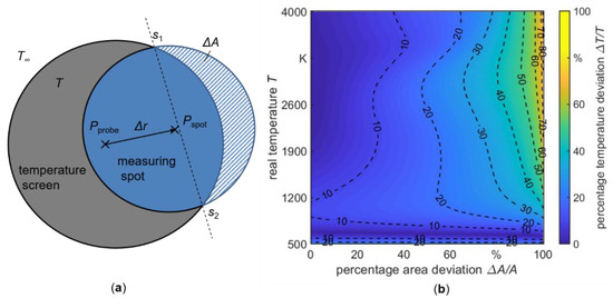 Influence of positioning errors on the pyrometric measurements: (a) geometric deviation of the measuring spot, and (b) resulting relative temperature deviation exemplarily for the emissivity of tantalum.