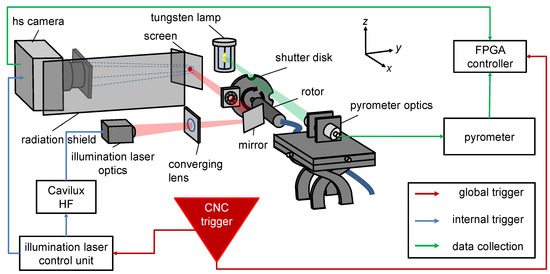 In order to analyze these internal delays, an experimental setup has been designed in which an event is created that triggers the applied measurements simultaneously during well-defined and short time intervals, as depicted in Figure 9. The continuous heat source that is to be detected by the pyrometer is implemented by a tungsten lamp with an operating temperature of approximately TW ≈ 2000 °C. The detectable event for the high-speed camera is given by the visibility of the illumination laser spot. A shutter disk with a radius of R = 47.5 mm is used to interrupt the corresponding beam paths with a frequency defined by the rotation speed and the diameter of the semicircular notches. The beam path of the illumination laser and the focus of the pyrometer are arranged in such a way that the camera and the pyrometer can detect the event at the same angular position of the shutter disk. Based on the factual synchronicity of the physical events, it is now possible to match the measured signals and thereby find the systematic delay between the measured signals.