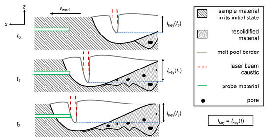 Besides the issue of imperfections of the sample design, the reproducibility of the experiments is additionally subjected to fluctuations in the shape of the keyhole. Especially the fluctuations of the keyhole depth as depicted in Figure 11 are important to the interpretation of the measured temperatures. These fluctuations are not predictable by now and cannot be controlled by the experimental boundary conditions. Although the absolute measuring depth as seen from the sample’s surface is controlled by the sample design, the relative measuring depth at the keyhole wall is also determined by the total keyhole depth itself. As it is not possible to predict or even control the fluctuations during each measurement performed under equal experimental conditions, the relative measuring depth is arbitrary, as the keyhole depth in the valid RoM remains unknown. In Figure 11, it is shown schematically that, at t2, the keyhole depth takes the value lkey(t2). As lkey(t) is also sensitive to boundary conditions that are beyond the control of the experimenters, lkey(t2) might differ for each measurement.