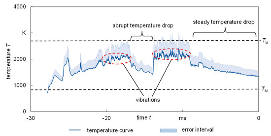 Throughout the experiments, eight measurements were conducted successfully. The temperature profile obtained from the valid RoM, as distinguished in the previous section, is chosen as the example for discussion (Figure 12). The temperature starts at values slightly below the melting point of aluminum. In the beginning, the temperature curve is rather smooth and, then, becomes increasingly noisy. In this early stage of the interaction between the melt pool and the refractory probe, damage to the probe is unlikely, so the noise is not ascribed to scattered radiation or reflections of any kind but, rather, to potential vibrations of the melt pool that are transferred to the probe. Thereby, the angle between the temperature screen and the beam path of the pyrometer might change in short time scales, influencing the detected intensity of the thermal radiation.