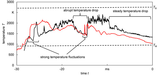 The pronounced temperature drop at the end of the depicted region is related to the blow-out that occurs when the keyhole reaches the tantalum foil. It is possible that the fact that the temperature drops within a finite time interval and not abruptly is due to the cooling of the tantalum foil as a consequence of the exposure to gaseous convection by shielding and ambient gas entering the crater left behind by the blow-out. Strong fluctuations of the temperature at time scales of 2 ms up to 6 ms can be seen at the beginning at t ≈ −26 ms and in the middle of the displayed curve at t ≈ −15 ms. To the best of our knowledge, it remains unclear whether these deviations emerge from changes in the probe structure, e.g., from the thermal expansion of the tantalum foil, thereby changing its curvature or its whole position on the tube. This could happen as the force-fit connection between the tantalum foil and the tube may no longer exist when the foil starts to expand at high temperatures. The exposition to the flow velocity of the prerunning melt could cause a tilting of the temperature screen, which could account for the strong and abrupt temperature changes on time scales too long, as they could be ascribed to vibrations. The latter ones, as they are labeled in Figure 12, exhibit frequencies of fvib = 2 kHz to 5 kHz and, therefore, possibly emerge from the keyhole oscillations, according to [14]. A comparison of the two temperature measurements obtained during the weld processes executed under equal conditions and with the same set of process parameters is given in Figure 13. In both experiments, a blow-out occurred when the keyhole reached the approximate position of the refractory probe; thus, the measurements are comparable judging by the apparent outer circumstances. Although the curves exhibit deviations of up to ΔT = 800 K at certain points, qualitatively, they show significant similarities. Apparently, the temperature profile represented by the red curve in Figure 13 shows a rather smooth course in contrast to the second curve. This is an indicator that noisy temperature curves in this region of measuring may indeed be ascribed to an imperfect sample design rather than indicating physical phenomena in the investigated system.