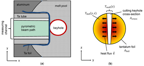 Considering the estimated size of the keyhole of about dkey ≈ 600 µm to 900 µm at the top and regarding the typical shape becoming narrower with the increasing depth, the inner probe diameter of dprobe = 600 µm is too large to perform a pointwise measurement at the keyhole front, as depicted schematically in Figure 14. Instead, it is likely that the recorded temperatures correspond to the average heat radiation emitted from the tantalum screen. The real temperature of the foil, in turn, results, on the one hand, from the heat transfer mechanisms acting on its outside surface, i.e., of the region of interest within the melt pool in the vicinity of the keyhole front wall, and, on the other hand, from heat propagation inside the tantalum foil. Based on Equation (2) and using the notations as shown in Figure 14, the average intensity on the temperature screen is given by: