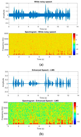 Firstly, the proposed method was evaluated on the white noise and then, the other colored noise were considered in the experiments. The proposed CNMA-SBAPA was evaluated on real and simulated data in comparison with the LMS, traditional APA, RLS, DB-MWF, and MNMF-MVDR algorithms. Figure 11 shows the time-domain and spectrum for the noisy and enhanced signals in the presence of white noise for SNR = 0 dB. As seen in these figures, the proposed CNMA-SBAPA method decreased more level of the noise with less distortion in comparison with other works. However, the numerical values are necessary for comparison. In the following, the experiments were evaluated with quantitative and qualitative criteria.