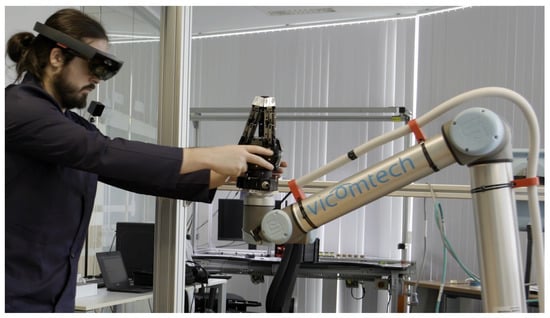 - Malỳ, I.; Sedláček, D.; Leitão, P. Augmented reality experiments with industrial robot in industry 4.0 environment. In Proceedings of the 2016 IEEE 14th International Conference on Industrial Informatics (INDIN), Poitiers, France, 18–21 July 2016; IEEE: Piscataway, NJ, USA, 2016; pp. 176–181. [Google Scholar]