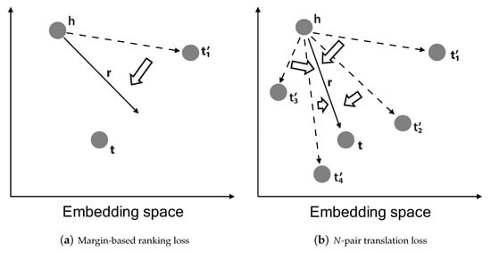 Translation-based knowledge graph embedding is one of the embedding models that finds vector representations of h, t, and r by compelling the vector of t to be close to the sum of the vectors of h and r [9]. Several variants have been proposed by modifying a score function to find better vector representations [10,11,12,13,14]. These translation-based embeddings are usually trained by minimizing the margin-based ranking loss over the knowledge graph. That is, the scores of positive triples are forced to be lower than those of negative triples. In order to adopt the margin-based ranking loss, negative triples against the knowledge graph are required, but knowledge graphs contain only positive triples. Thus, negative triples are prepared by replacing the head or the tail of positive triples randomly under the closed-world assumption [9].