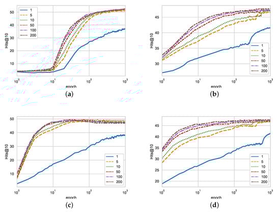 We first examine the effectiveness of negative triples. Thus, the change of performances is investigated according to N, the number of negative triples. The result is shown in Figure 2. Figure 2a,b are the performances of TransE on WN18RR and FB15K-237 with a various number of negative triples, while Figure 2c,d show those of TransD. In all figures, the X-axis is the number of epochs, and the Y-axis represents the Hits@10. Here, ‘1’ (expressed as the blue curve) implies that only one negative triple is considered in training the embedding models. Therefore, the embedding model with ‘1’ is equivalent to that trained with the margin-based ranking loss. Similarly, means N negative triples are used. Thus, the performances of N are obtained using the N-pair translation loss. As these figures show, all non-blue curves are always above the blue curve regardless of epochs. That is, the performances of the N-pair translation loss are higher than that of the margin-based ranking loss. This proves that considering multiple negative triples in every parameter update leads to significant performance improvement over adopting one negative triple.