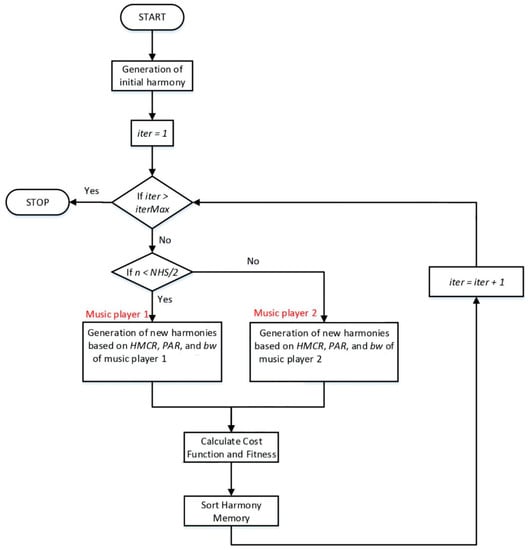 - Geem, Z.W. Novel Derivative of Harmony Search Algorithm for Discrete Design Variables. Appl. Math. Comput. 2008, 199, 223–230. [Google Scholar] [CrossRef]