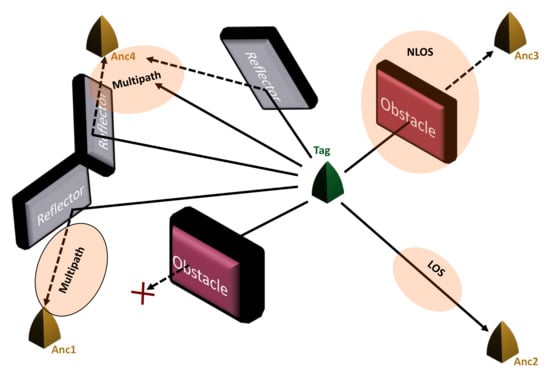 In fact, the multi-class identification of UWB measurement data (LOS, NLOS, and MP) in the real world is challenging in indoor environments because a variety of physical effects can distort the direct path LOS signal in different ways [3,17] (Figure 1). This includes walls, furniture, humans, the orientation of the UWB antenna, etc. Therefore, machine learning methods are attractive solutions for solving such a problem.