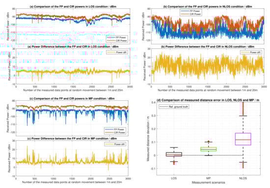 Illustration of the LOS, NLOS, and MP conditions in UWB ranging systems: (a–c) Comparison of the FP power, the CIR power, and the difference between the two power levels (FP and CIR power) in three scenarios: (a) LOS, (b) NLOS, and (c) MP conditions. The measurement was conducted for the three scenarios for random movement between 1 and 24 distances. (d) Comparison of the measured distance errors in the three mentioned conditions (LOS, NLOS, and MP) in static scenarios.