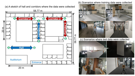 Illustration of the scenarios where training and test data were collected for evaluation: (a) A sketch of the building where the experimental data for training and test were collected. (b) Training data were collected for LOS, NLOS (including human blocking) and MP conditions in a laboratory, a large hall, and a corridor (blue color in (a)). (c) Similar to (b), test data were collected in a different room (including different types of furniture and NLOS human blocking) and a different corridor (red in (a)).