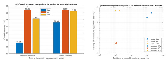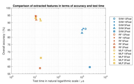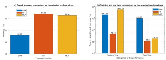 In summary, RF was the fastest among the three methods for the given dataset in terms of the training time (Figure 4). This was because the training time per sample data in RF only took in the order of microseconds. Meanwhile, SVM and MLP were in the order of several milliseconds depending on the configuration and setup. In terms of test time, SVM performed worst among the three with a test time in the order of milliseconds, while RF and MLP are in the order of microseconds.