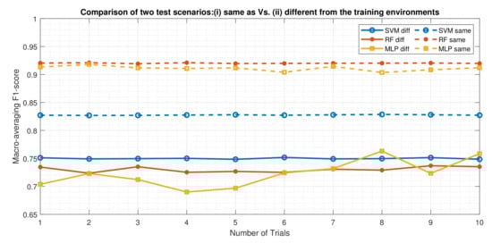 Based on the data given in Table 5, both the macro-averaging F1-score and overall accuracy showed that the SVM classifier gave the best performance when the training and test environments were different. The consistent outcome in SVM also revealed the reason why it is one of the most frequently used classifiers in the literature [9,10,17,21]. In contrast, RF performed the best among the three evaluated classifiers regarding the same training and test environments.