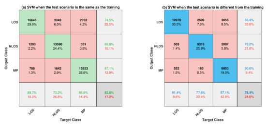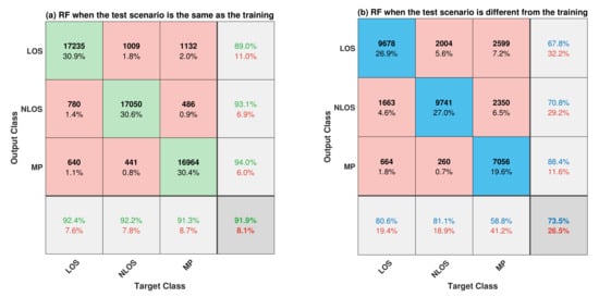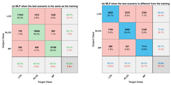 However, it was hard to clarify using Table 5 that the predicted accuracy of MP condition was significantly low compared to the other two classes in all evaluated classifiers in a scenario when the training and test were in different environments. This phenomenon could be detected using the confusion matrix as previously described in Section 7.2.