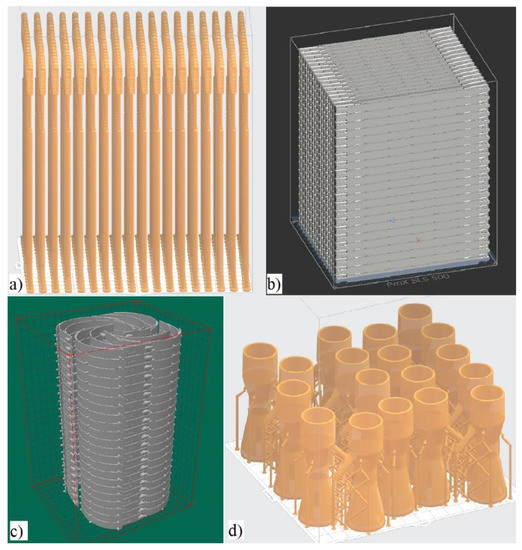 Packing solutions of parts in different build volumes: (a) nasal swab in Form 2; (b) face shield holder SLS optimized in ProX SLS 500; (c) face shield holder in ProX SLS 500; and (d) Venturi valve in Form 2.