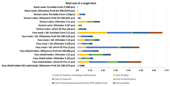 The total cost for each 3D printed batch is calculated by the summation of machine acquisition and maintenance costs, labor, raw materials, consumable items, sterilization, and a 25% overhead cost. To estimate the individual cost per part, the total cost of 3D printing the batch is divided by the size of the production batch. For instance, the cost of producing a batch of 400 nasal swabs using the Formlabs Form 2 machine is about 130.5 €, which translates to 0.33 € for a single nasal swab. Similarly, the cost of producing the same part on a ProX SLS 500, which is a larger industrial PBF machine, is 0.40 €, as shown in Table 7. The total cost of producing a single item with different cost components is shown in Figure 2. Two different batch sizes, used for the production of identical parts, in Ultimaker 2 confirm that a percentage increase in costs is significantly lower than the percentage increase in batch size. This is because certain pre- and post- processes, i.e., labor, sterilization, and overhead, which can be seen as dominating factors for small batches in Figure 2, are inevitable, and possess higher throughput capacity than just one or two parts.