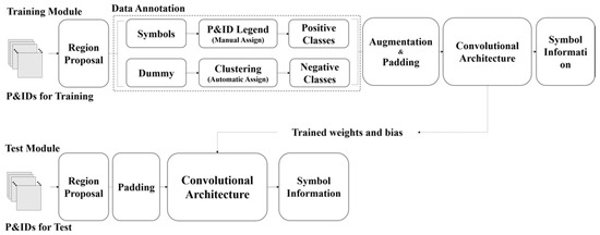 Piping and instrument diagrams (P&IDs) are a key component of the process industry; they contain information about the plant, including the instruments, lines, valves, and control logic. However, the complexity of these diagrams makes it difficult to extract the information automatically. In this study, we implement an object-detection method to recognize graphical symbols in P&IDs. The framework consists of three parts—region proposal, data annotation, and classification. Sequential image processing is applied as the region proposal step for P&IDs. After getting the proposed regions, the unsupervised learning methods, k-means, and deep adaptive clustering are implemented to decompose the detected dummy symbols and assign negative classes for them. By training a convolutional network, it becomes possible to classify the proposed regions and extract the symbolic information. The results indicate that the proposed framework delivers a superior symbol-recognition performance through dummy detection.