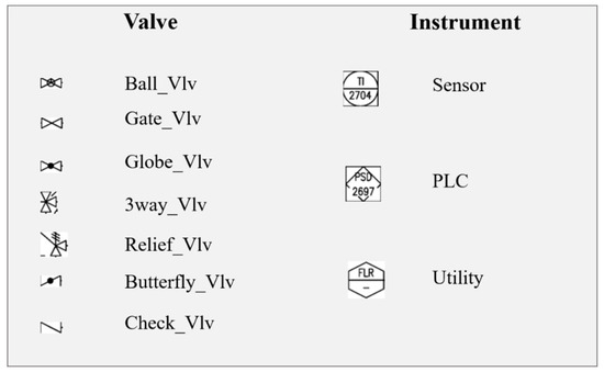 Here, we propose our R-CNN framework for recognizing graphical symbols in P&IDs, as shown in Figure 1. There are two main types of graphical symbols targeted in this study: valves and instruments. These symbols have characteristics such as size and shape, as shown in Figure 2. Using these characteristics, we construct an RPN by modifying several image-processing techniques. There are two types of proposed regions: symbol and dummy. For data annotation of the symbols representing positive samples, a P&ID symbol and legend sheet are referred to, which provide the standard set of shapes and symbols for documenting the diagram.