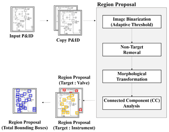 There are several points of incongruence in the selective search algorithm. For the proposal of candidate regions, the selective search algorithm uses the traits of an image, such as its color and boundary. However, this is not appropriate for the detection of an object in a binary image, such as an engineering diagram. To investigate the most-suitable algorithm for an engineering diagram, we implement sequential image processing to create proposal regions; this detects the potential target symbols by their characteristics. The sizes and shapes of plant symbols are specified in the diagram; therefore, it is possible to modify the image processing technique for each type of target symbol—valves or instruments—as they have a set size and aspect ratio in copies with identical resolutions. Thus, using copies of the input image, the characteristics of each target symbol can be reflected and sought for in each step. To modify the progress, we divide it into four parts: (1) image binarization, (2) non-target removal, (3) morphological transformation, and (4) CC analysis, as shown in Figure 3.