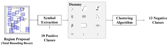 From these proposed regions, we obtained a pool of images containing symbols and dummies. In the P model, only the symbol data are constructed as the dataset for the classification model. On the other hand, in the PN models, both symbols and dummies are incorporated into the model. To assign classes to the dummies, a series of detected dummies was decomposed through the clustering algorithms. Consequently, the effects of negative classes on symbol recognition in engineering diagrams were analyzed; these are described in the following section.